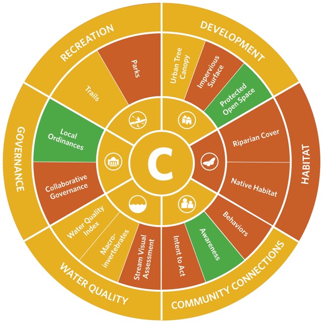 Although the overall grade remains unchanged from 2021 (“C” with an overall score of 46%), there are signs of progress in the Riparian Cover, Protected Open Space, and Macroinvertebrates indicators. At the same time, declines in the Local Ordinance, Parks, and Stream Visual Assessment indicators, along with the fact that 58% of indicators scored a D or lower, highlight the urgent need for stronger, sustained conservation efforts.